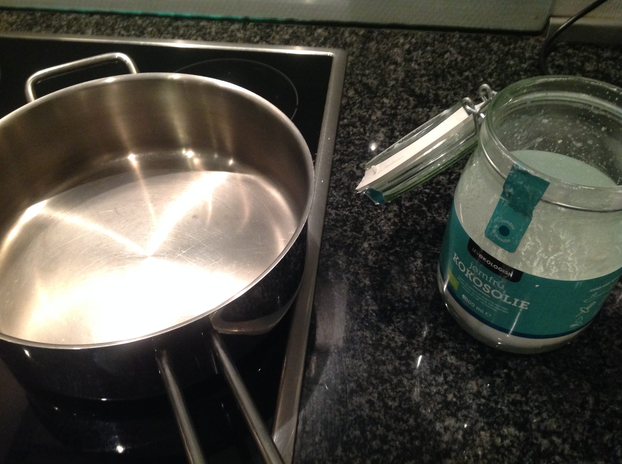 - Kokosolie(ca.1 spsk) kommes i en bred gryde eller pande med høj kant.