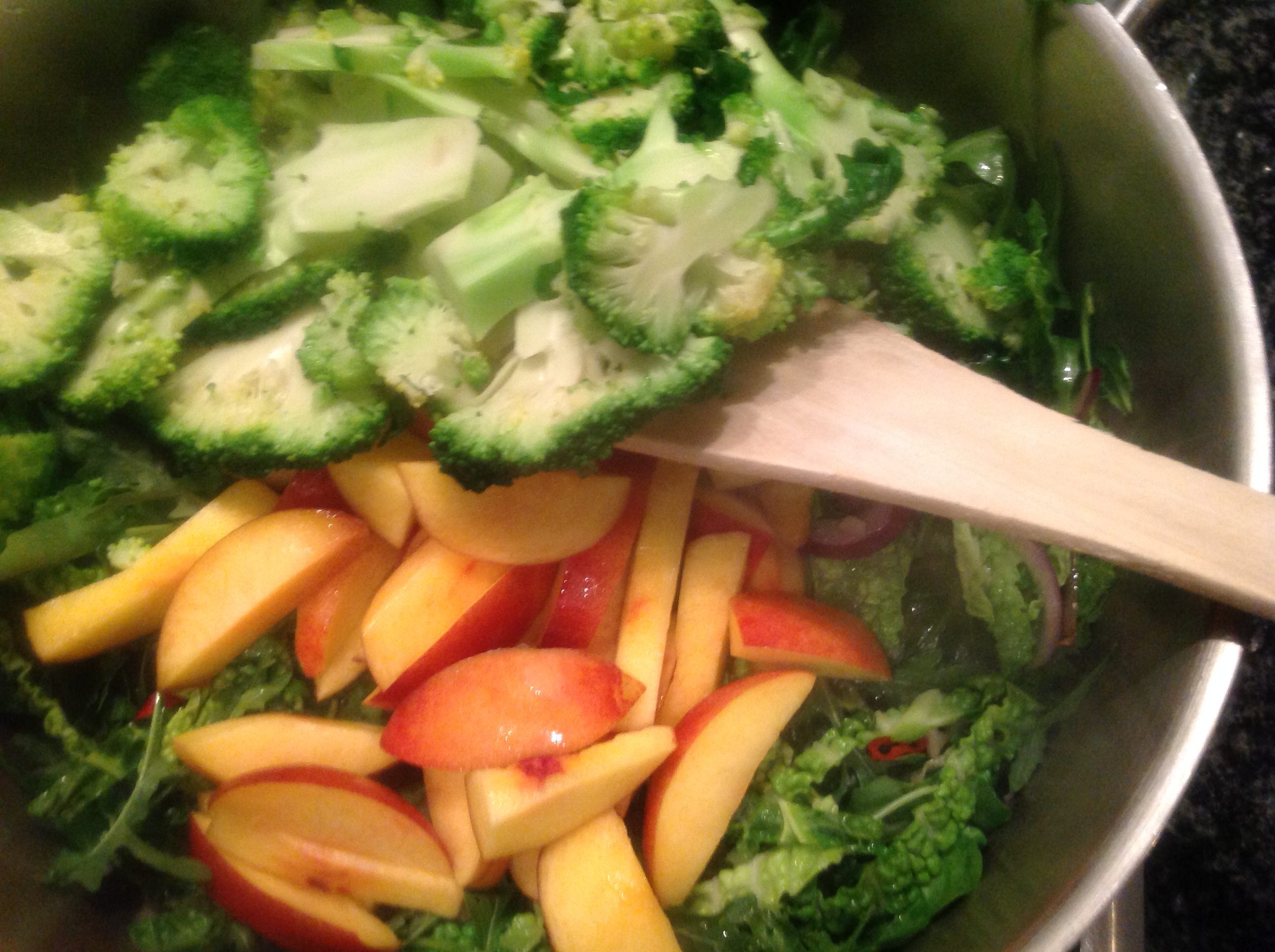 - Tilsæt broccoli og fersken i. Efter et par min, smages der til med salt. Jeg brugte en saltblanding med koriander og chili.