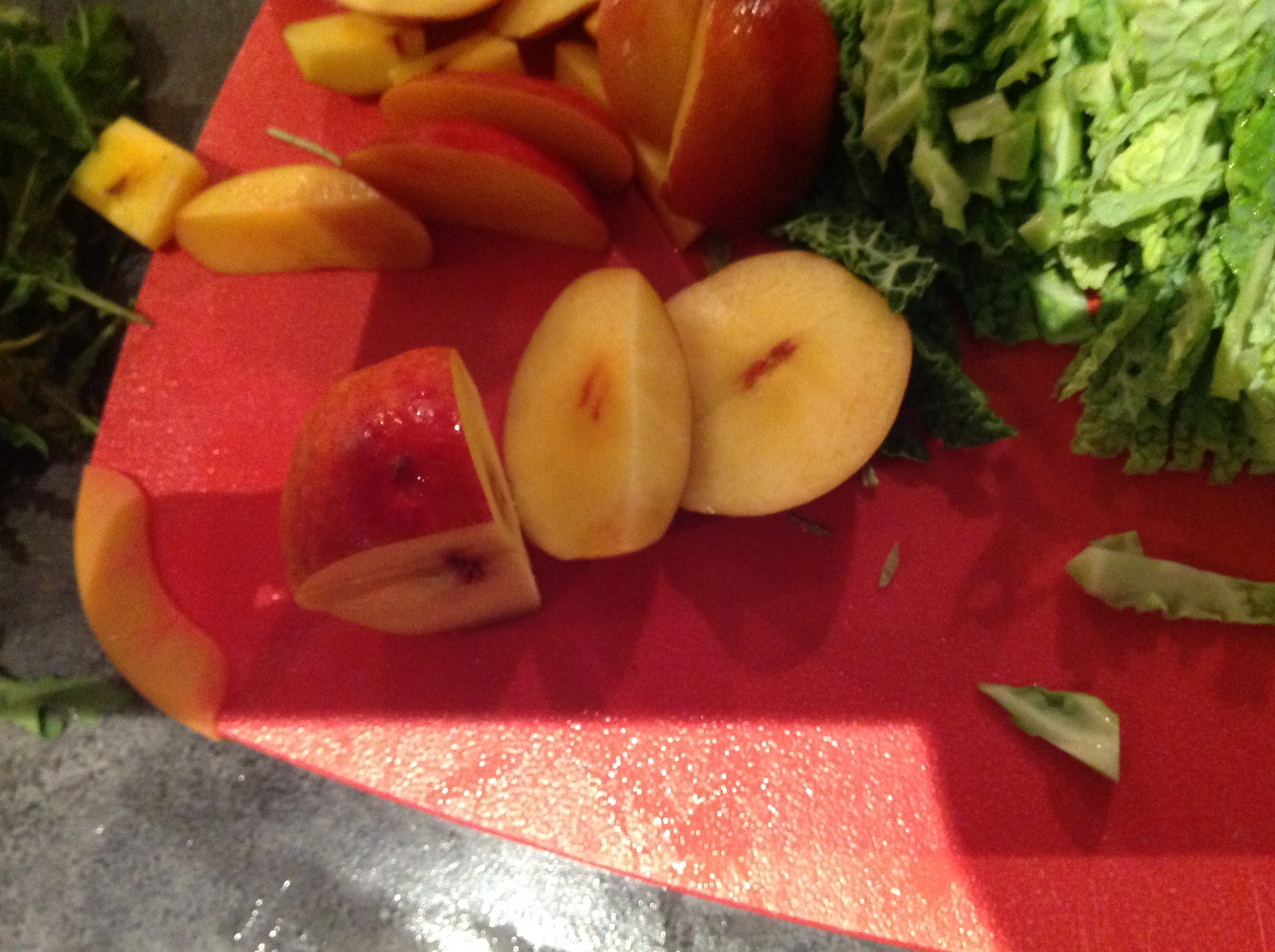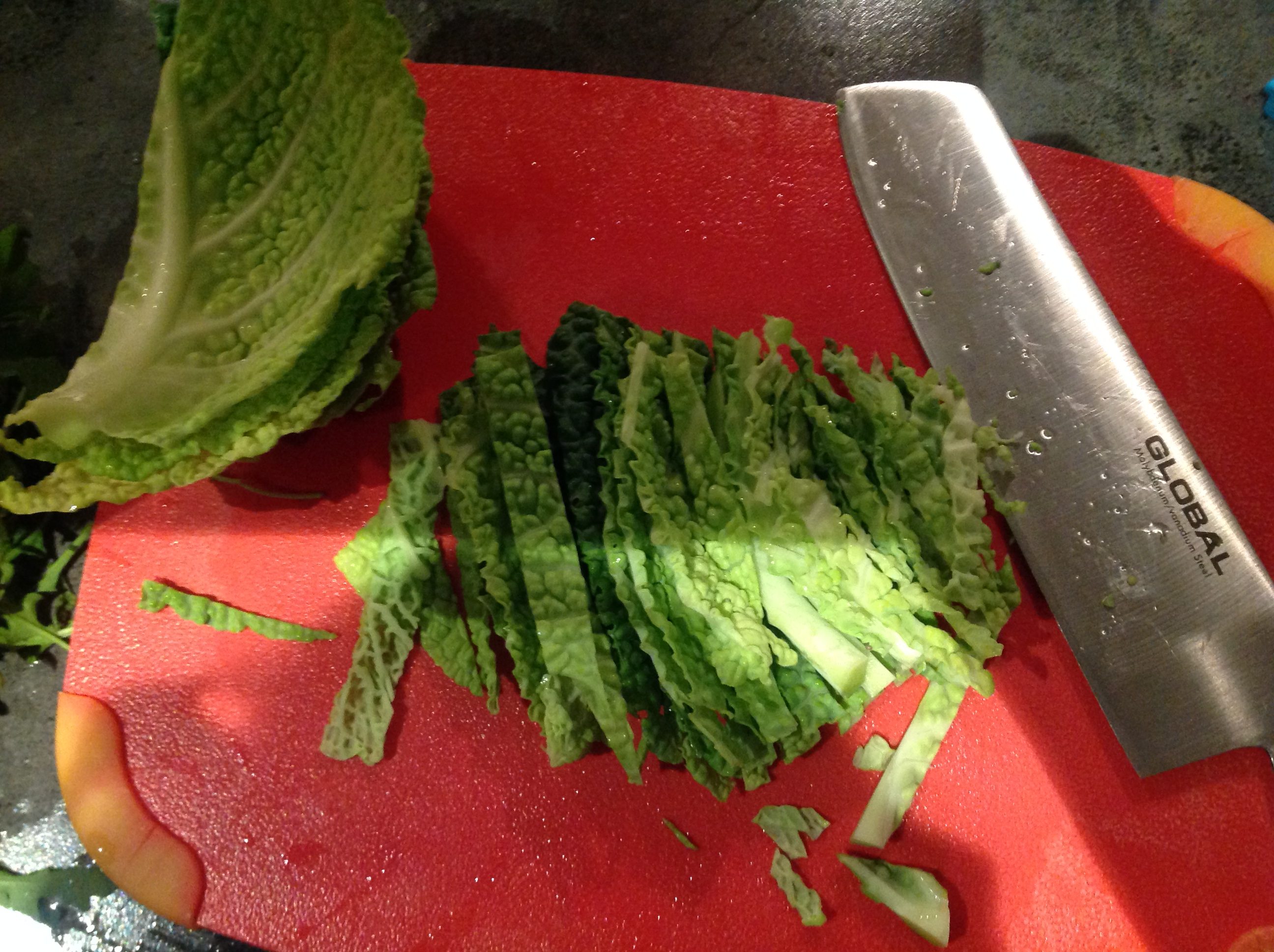 - Imellemtiden snittes savoykål, skylles og drypper af i en sigte.