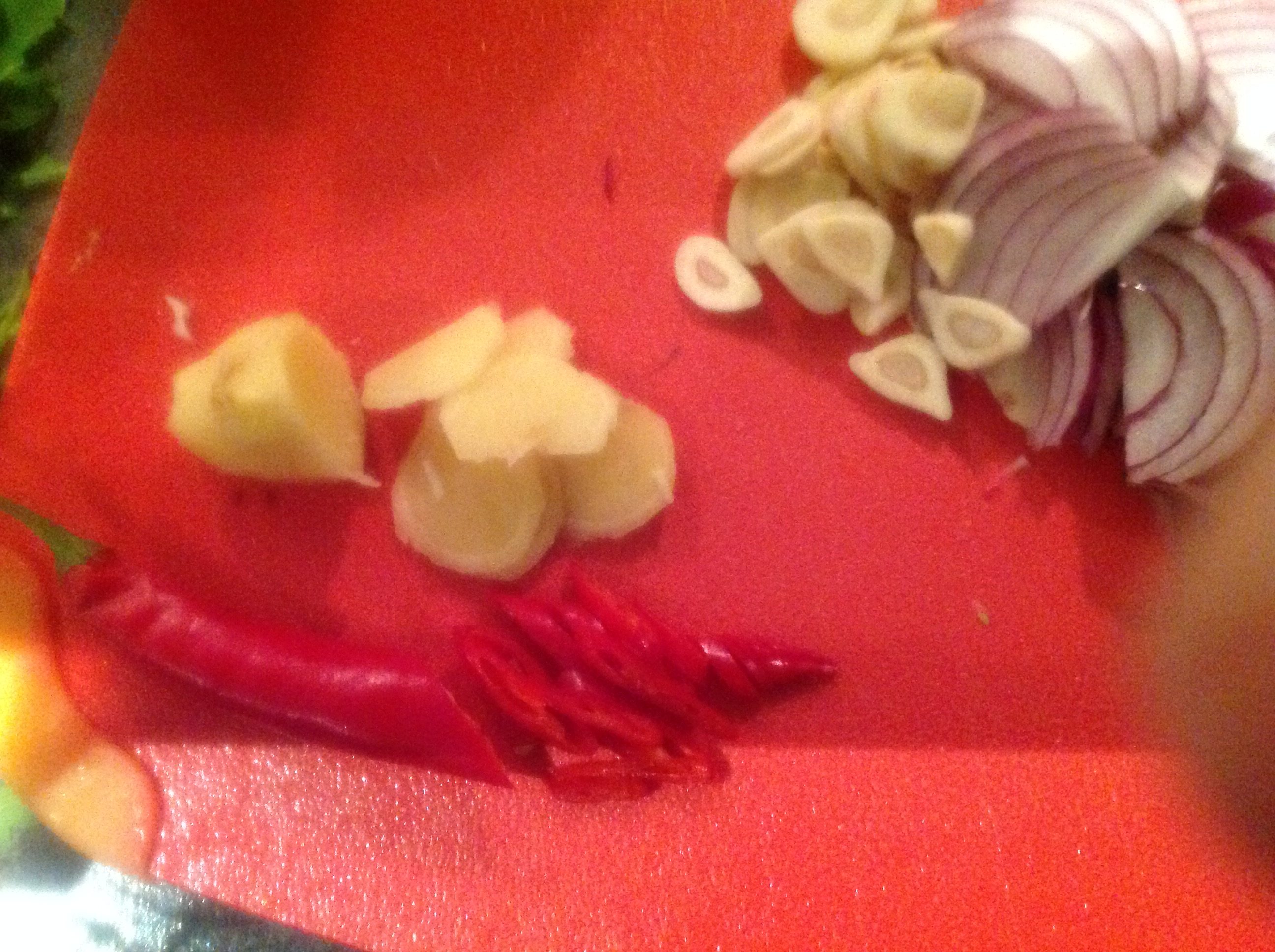 - Ingefær på str. med en tommelfinger.Skrab skrællen af med en ske og skæres i tynde skiver.Halvdelen af en chili skæres i tynde skiver.