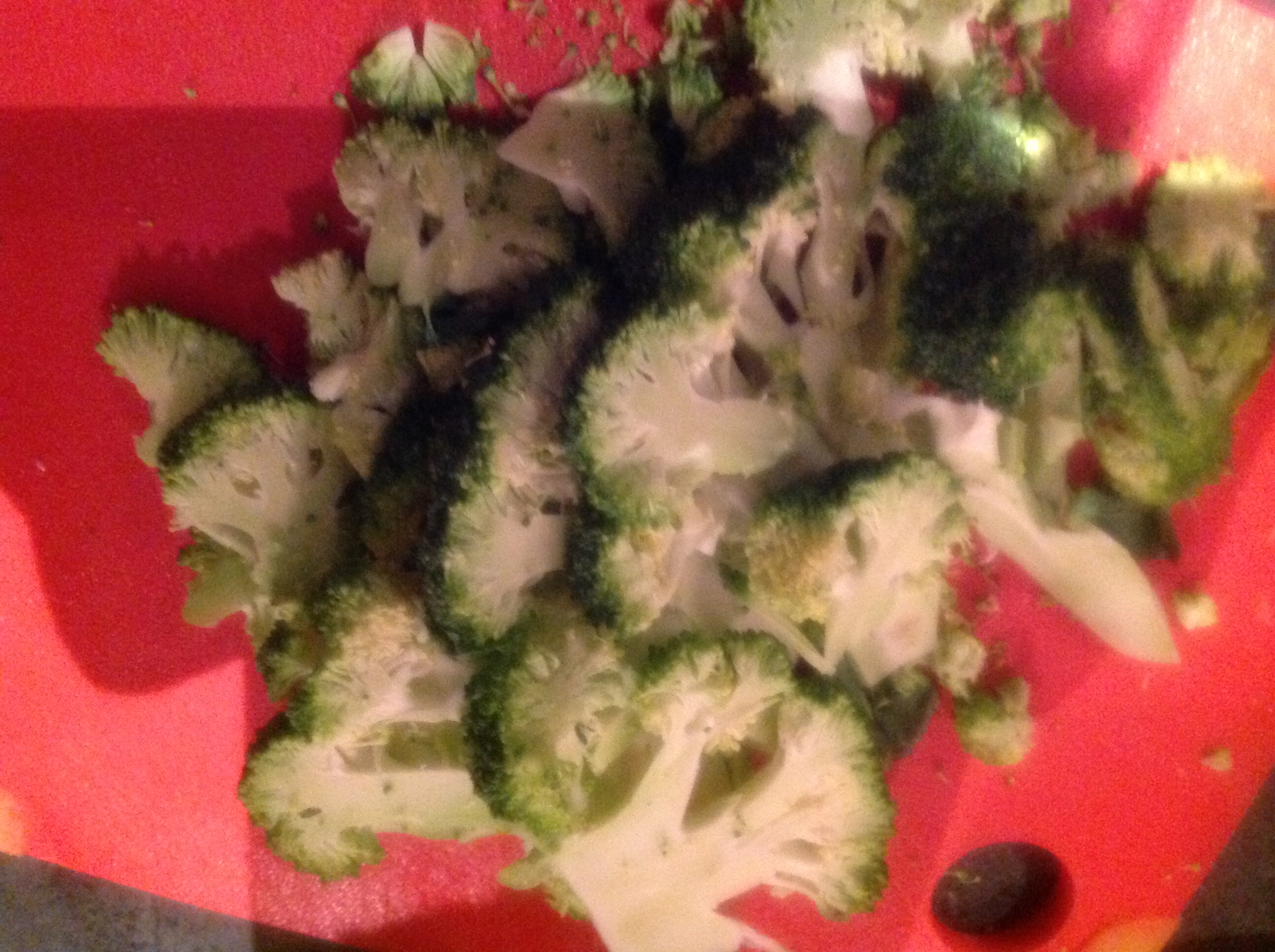 - Tilsæt broccoli og fersken i. Efter et par min, smages der til med salt. Jeg brugte en saltblanding med koriander og chili.