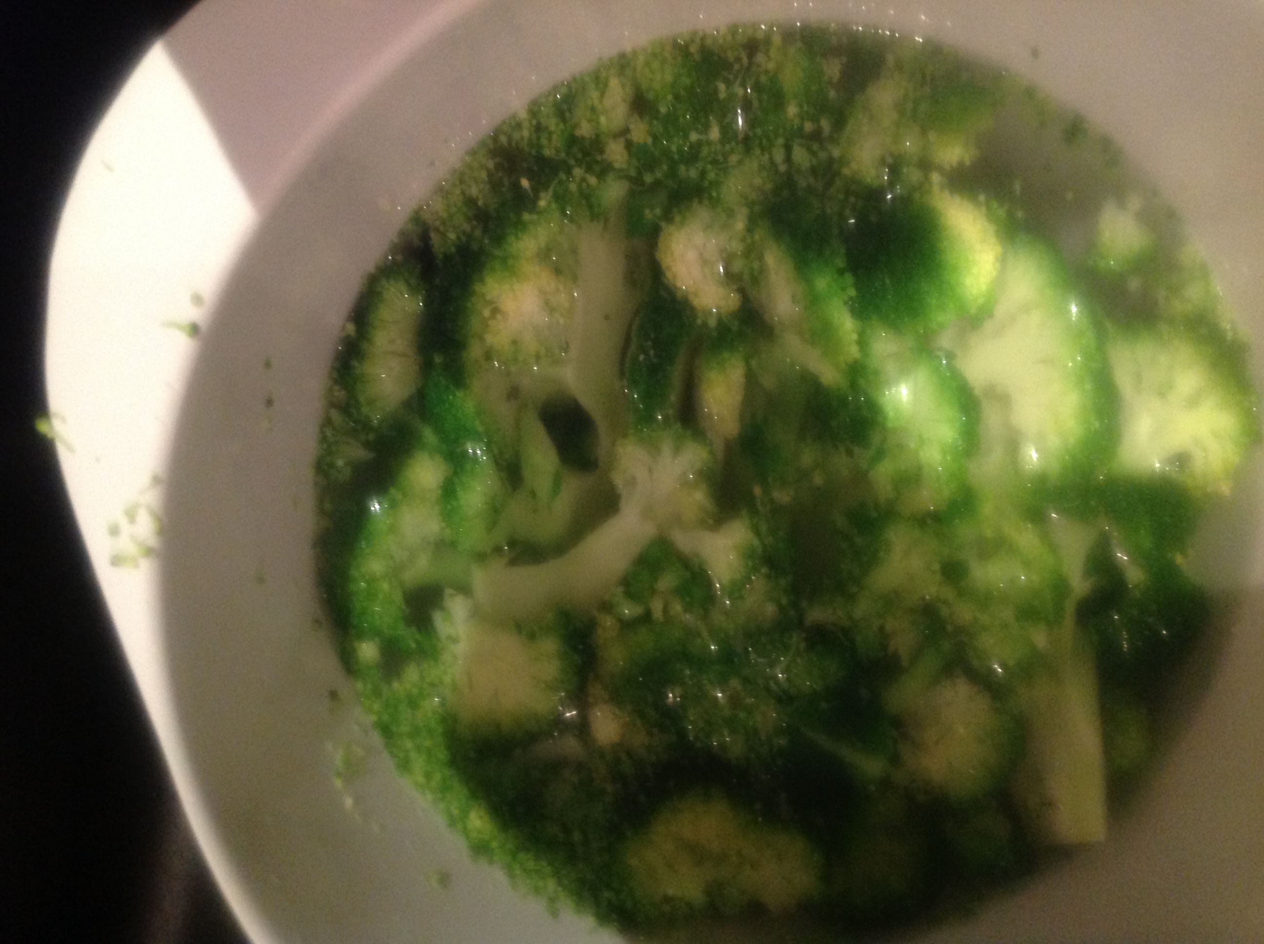 - Broccolien skæres i skiver, skylles og kommes i en skål, derefter hældes kogende vand over.Efter 3-4 min hældes broccolien i en sigte.