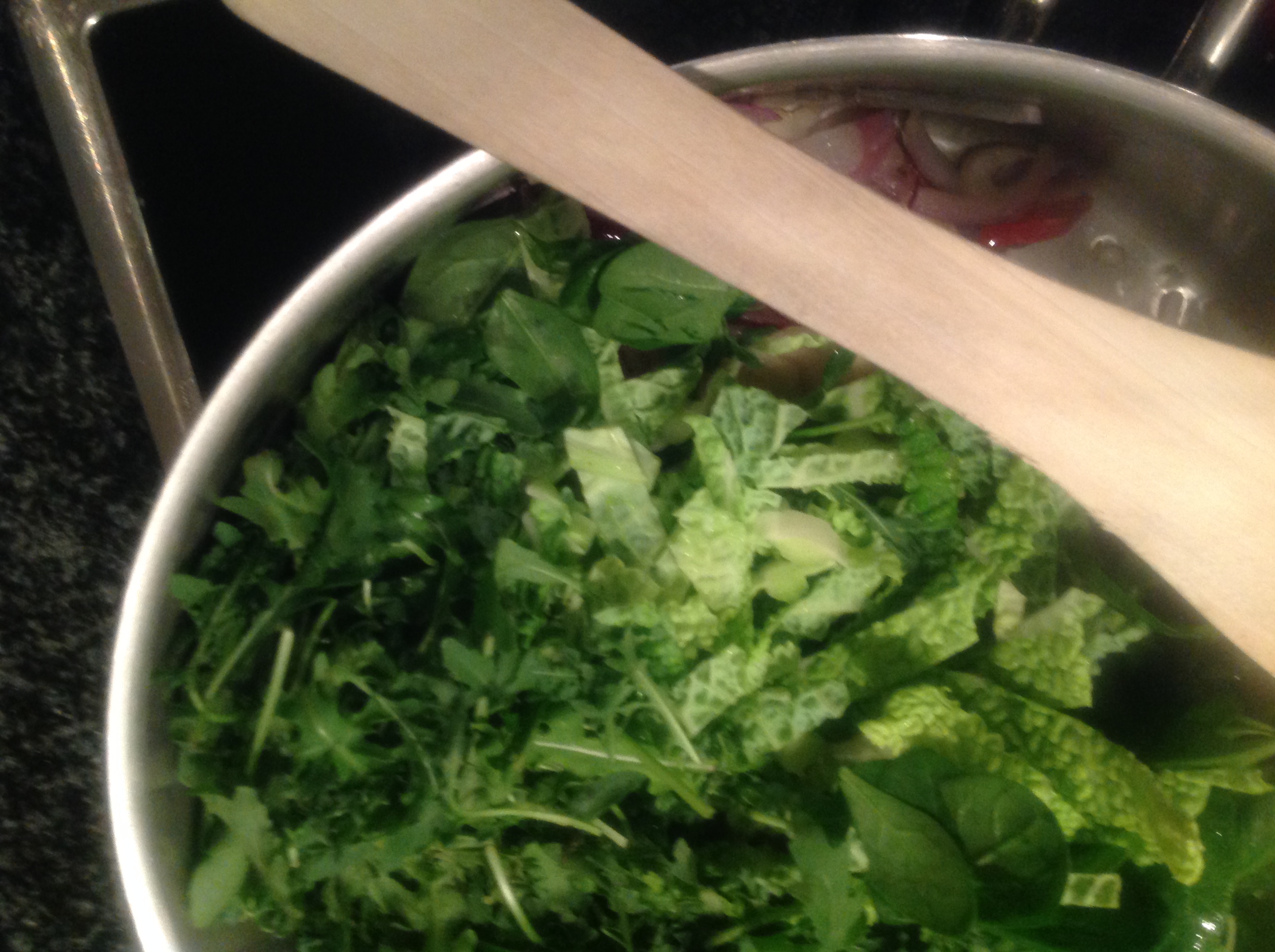 - Kom savoykål,ruccola i gryden med løg blandingen og vend det rundt i et par min.