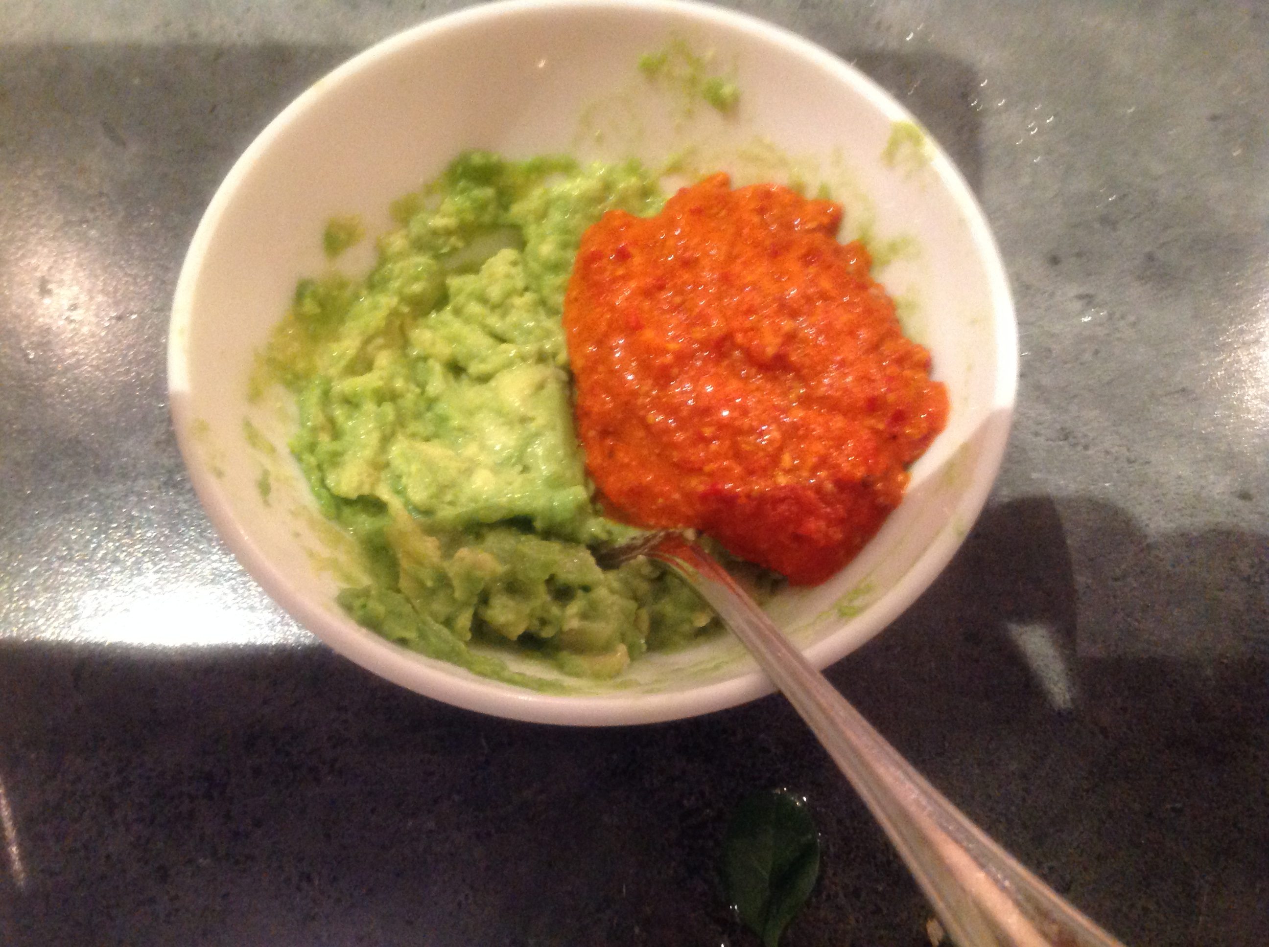- Avocadoen moses med en rest Mojo/pureret bagt peberfrugt,granatæble dip (Meyer produkt købt i supermarked).smag til med salt og peber.